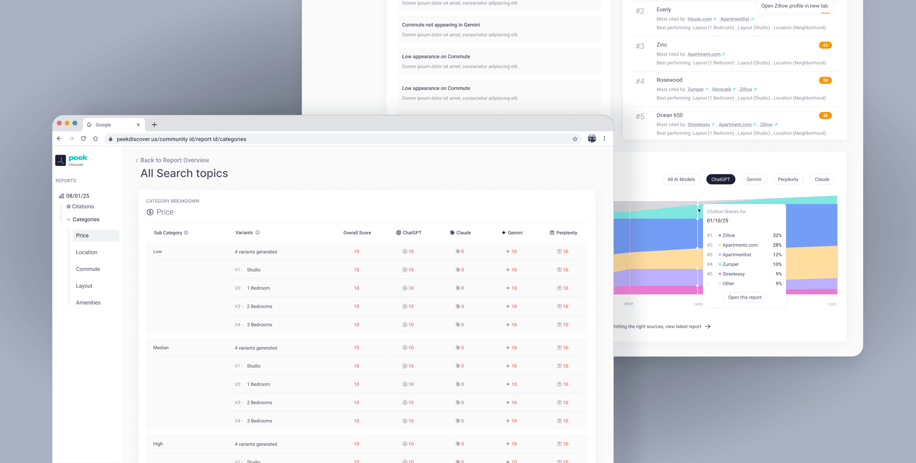 Peek Discover tracks how often properties appear in AI search across all major AI models.